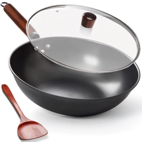 Carbon Steel Wok Pan with Lid Spatula Nitrided Nonstick Anti-rust for All Stoves